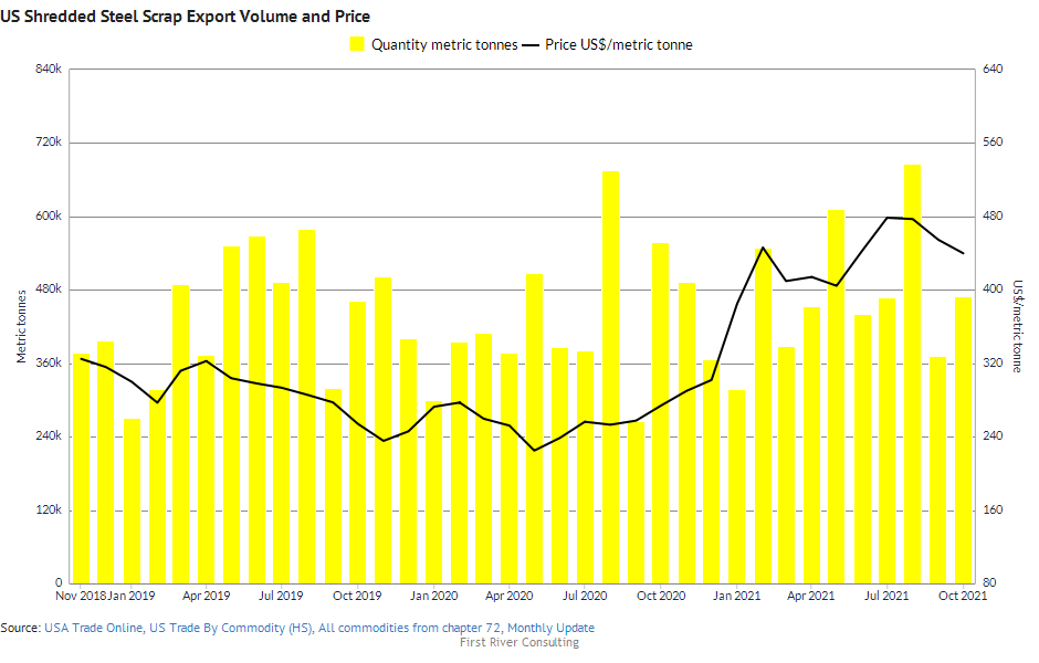 As you can see in the chart below, shredded steel scrap export volumes (left axis, yellow bars) have been volatile since the beginning of the year, with October, 2021 export volumes at 470,000 metric tonnes, while the export volume trend over the last 3 years is up. The rise in the export price (right axis, black line) is even more clear, from a value of US$274/metric tonne in October, 2020 to US$440/metric tonne in October, 2021. November, 2021 data will be available from USA Trade Online and in the Steel Data Room by the end of this week.