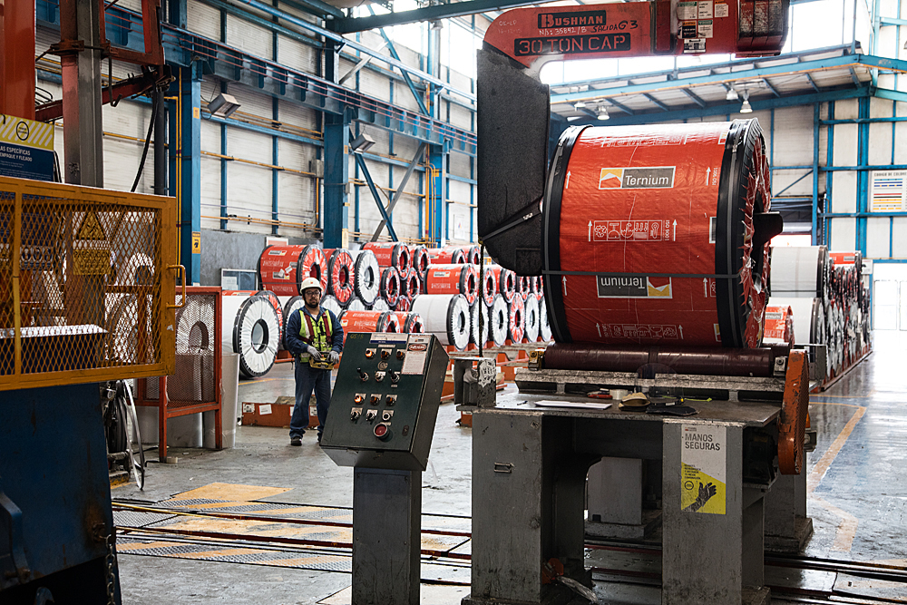 End of galvanizing line, employee stacking finished product at Ternium Juventud, Mexico, from Worldsteel Image Library