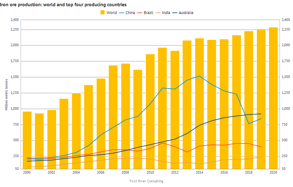 In the Steel Data Room, you can easily create charts to export into your presentations which combine data from different sources. The chart below shows world iron ore production from the Australian Government’s Department of Industry together with the iron ore production by country from the British Geological Survey. The chart automatically updates when the new data is published (the 2020 production data by country will be available in spring, 2022).
