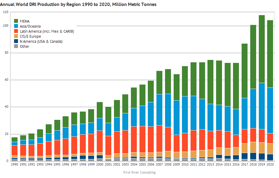 Our steel industry readers will probably be interested to know that Midrex just published its 2020 World Direct Reduction Statistics report. World DRI production reached 104.4 million metric tonnes in 2020, a 3.4% decline from 2019 levels.