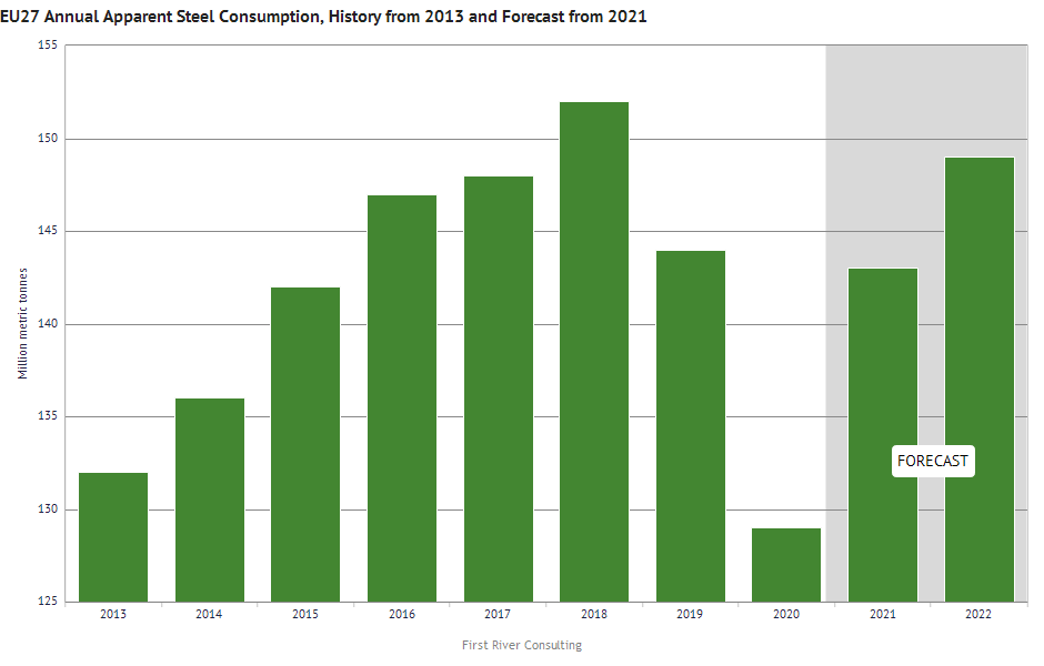 The chart below illustrates annual apparent steel consumption in the 27 European Union Countries from 2013 to 2022. Eurofer expects consumption in 2021 to rebound to close to 2019 levels at 143 million metric tonnes and to reach 149 million tonnes in 2022, still lower than 2018’s recent peak of 152 million tonnes.