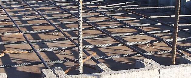 “Metal plastic tipped bar chairs supporting reo steel to give correct cover on a suspended slab with reinforced concrete masonry walls” by Bill Bradley User:[1], CC BY-SA 3.0 http://creativecommons.org/licenses/by-sa/3.0/, via Wikimedia Commons