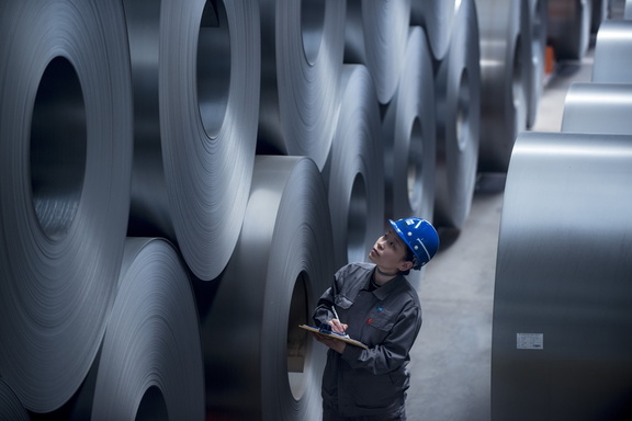 A worker checks rolled steel sheet at HBIS Tangsteel Photo from Worldsteel Image Library by worldsteel / Shawn Koh, Image ID 717