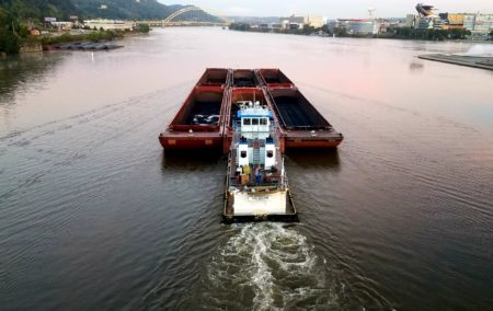 Coal barge transport next to The Point facing Pittsburgh’s West End Bridge