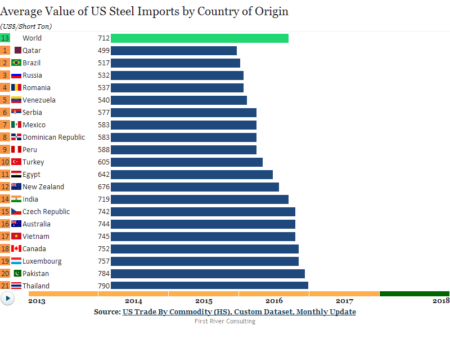 Another revealing dynamic ranking chart from the Steel Data Room shows you how the average value of US steel imports per ton have changed over time by country. Watch the dynamic version here or register to create you own. Includes carbon & alloy semi-finished, flat & long finished products only. No stainless, no pipe & tube.