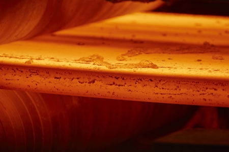 Close-up of hot slab in the continuous casting process